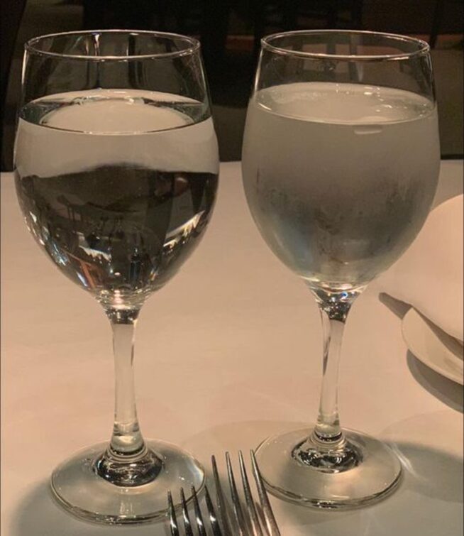 At first glance, the water glass on the left of a fancy Italian restaurant seems more appealing than that on the right. Only because it is transparent, showing the clarity one assumes is synonymous with cleanliness.